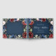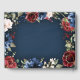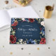 Design features beautiful watercolor floral elements in various shades of red, burgundy, blush pink and more with printed gold coloured geometric flower overlays, greenery. etc. over a navy blue watercolor textured (printed) background.