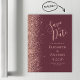 The left-hand edge of this elegant save the date magnetic card features a rose gold faux glitter border. The customisable text combines rose pink handwriting, copperplate and italic fonts on a dark burgundy background.