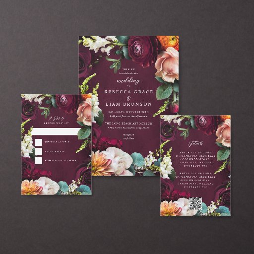 Real photographed florals in burgundy, oranges and white perfect for fall weddings. Touches of sage greens in eucalyptus and rose leaves. All of the text is editable. Backer element with names is optional.