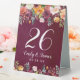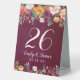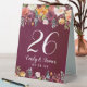 Rustic romantic style wedding table number cards feature a stylish monogram with numbers framed by a floral watercolor arrangement with beautiful roses, dahlias, peony flowers, and greenery, in a gorgeous autumn palette of burgundy red, golden yellow, peach orange, blush pink, and shades of green. Rich burgundy red background colour.