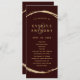 This wedding program features a faux gold circle frame with an elegant ampersand and simple calligraphy with a burgundy marsala background.