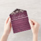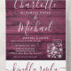 All in one wedding invitation featuring pretty string lights, mason jars, signature style names and chic typography on a burgundy rustic wood background. The invitation includes a perforated RSVP card featuring a QR code. Designed by Thisisnotme©