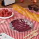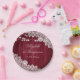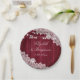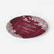 Elegant and romantic rustic burgundy wedding party paper plates inspired by barn wood, white floral lace and string lights.