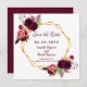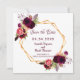 An elegant and romantic wedding Save the Date card. A faux gold coloured geometric shaped frame with Bohemian, boho style watercolored roses, flowers in burgundy and pink. Templates for your names, date and place of the wedding. White background on front. Burgundy letters.