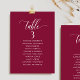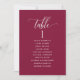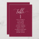 Help your guests find their table with this elegant modern seating plan cards with guests names. Double sided cards so guests can look from both, front or back for their names. Clear space all around giving you the liberty to use clips or punch hole for hanging displays, or use table holder/frame. Burgundy background and white text. Modern hand written calligraphy details. Several colour options. Have all table numbers in same colour or mix colours according to your event's colour theme. Part of our "Berry, Blue and Burgundy Floral" collection.