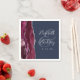 These elegant modern wedding napkins feature a burgundy watercolor design trimmed with silver faux glitter. Easily customize the silver gray text on a navy blue background, with the names of the bride and groom in handwriting calligraphy over a large ampersand.