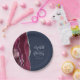 These elegant modern wedding plates feature a burgundy watercolor design trimmed with faux silver glitter. Easily customise the silver grey text on a navy blue background, with the names of the bride and groom in handwriting calligraphy over a large ampersand.