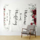 A burgundy watercolor floral Welcome To Our Wedding tapestry sign welcoming your guests to your wedding against a black background with white pretty script writing.