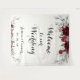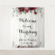 A burgundy watercolor floral Welcome To Our Wedding tapestry sign welcoming your guests to your wedding against a black background with white pretty script writing.