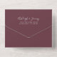 The left-hand edge of this elegant modern all-in-one wedding invitation and RSVP features a silver faux glitter border. The customizable text combines silver gray whimsical handwriting, copperplate and italic fonts on a burgundy background. The return address appears on the outside flap and the reverse side of the detachable RSVP card in silver gray text on solid burgundy. A QR code is included on the RSVP card for guests who would prefer to reply online.