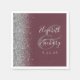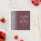 The left-hand edge of these elegant modern wedding napkins features a silver faux glitter design. The customisable text combines silver grey handwriting and copperplate fonts over a large ampersand on a burgundy background.