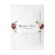 This burgundy spring calligraphy wedding invitation belly band is perfect for a simple wedding. The hand-painted design features green leaves, dazzling pink, blush, purple, red, white and burgundy dazzling roses, peonies neatly arranged in small cute bouquets.