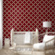 This peel and stick wallpaper features diagonally tiled gradient burgundy squares on a tan and white lattice background.