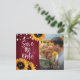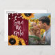 Rustic burgundy and sunflower wedding photo save the date postcard featuring sunflowers and string lights on a rustic wood background. Ideal postcard for a burgundy rustic country or barn wedding party inspired by sunflowers.