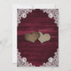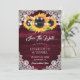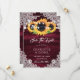 Burgundy rustic floral wedding save the date cards featuring sunflowers on a wood background adorned with white floral lace and string lights. Matching items available.