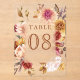 Elegant wedding table number featuring beautiful rustic flowers.