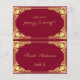 A vintage burgundy and gold wedding place card with the guest name and the table number printed on its front and the bride and groom names and the wedding date printed on the other side (that is the other half, before folding it). It has an antique frame with faux silver foil decorations and also faux silver inside (on the back, before folding it). All text is golden, written in elegant calligraphy. The background is burgundy.