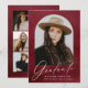 Celebrate your graduate’s achievement with this elegant graduation announcement featuring their photo inside a stylish arch frame against a rich burgundy watercolor background. "Graduate" is beautifully displayed in a modern white calligraphy script, with the graduate’s name, school, and graduation year elegantly showcased below. The back of this photo graduation announcement offers a grid-style layout for six additional photos, making it perfect for sharing more special moments. Personalise this sophisticated design to create a unique keepsake for high school or college graduates.