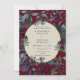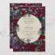 This burgundy wedding invitation features purple and red flowers, greenery and gold framed oval and gold script. Customise with your wedding event details.