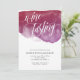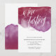 Wine tasting party invitation in white with a big splash of burgundy watercolor beneath wine tasting written in a swirly white script.