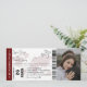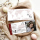 Burgundy destination wedding invitation boarding pass wedding ticket, a portrait of the engaged couple, a plane with a loop trail, and an easy customisable this invitation design. Remember to keep the text on the back of the monogram up to current.