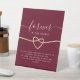 Elegant, simple red burgundy wedding memorial table pedestal sign with faux gold rope heart and modern calligraphy script.