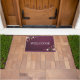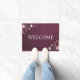 This welcome mat image features a luxurious burgundy background, creating a rich and inviting aesthetic. The pink, lavender and rose gold coloured flowers are artfully arranged in the upper left and lower right corners, creating a balanced visual composition. Centred between the floral arrangements, the word Welcome is in white text in capital letters. The flowers are in a realistic style with gradients of purple to light pink. The welcome mat is an aesthetic modern welcome mat in trendy modern colours. The mat has a sturdy latex action backing that allows for a non-slip grip. The mat is approved for indoors and covered outdoor areas. The welcome mat dimensions are 18" by 24".