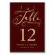 This table number card features whimsical flourish gold typography on a burgundy background. You can add your details in the customise menu. This menu is part of a beautiful matching wedding suite that can be fully personalised.