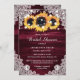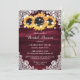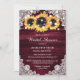 Beautiful rustic burgundy and sunflower bridal shower invitations featuring sunflower flowers and white floral lace against rustic wood background. Matching items available.
