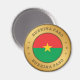 The Burkina Faso flag is inset into a rounded faux gold ring. The words "Burkina Faso" feature at the top and bottom of the design, and are of a pressed effect. The pair of three decorative stars across from each other, are also designed with a pressed effect.