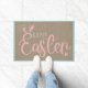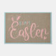 This cute Easter door mat features a fun "Happy Easter" graphic in pink and blue pastels against a faux burlap background with pink bunny ears and a heart accent.