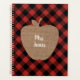 A teacher planner featuring a crayon drawing inspired illustration of a burlap apple over a red and black buffalo plaid background. Personalise with your name on front.