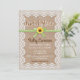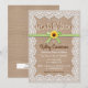 Have an elegantly country bridal shower with this invitation! Features a bright yellow sunflower, green gingham ribbon, white lace, and brown burlap texture background.