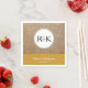 This simple and modern wedding napkin features a white circle with the monogram of the bride and groom on a photo of burlap background. Customisable text on a gold background near the bottom, features the names of the bride and groom and their wedding date.