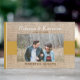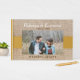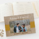 The design on this wedding guest book features a photo of textured burlap and is accented with a solid gold stripe across the centre. A custom photo frame, in the centre of the front allows you to add a photo of the couple. Custom text offers the names of the bride and groom and their wedding date.