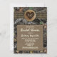 Burlap + Hunting Camo Bridal Shower Invitations - features a printed hunting camouflage background with design elements of burlap and twine. A printed brown burlap box contains the text. A printed log slice with a burned heart sits on the twine. You can "carve" initials into the heart by changing the demo text.