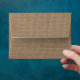 An envelope with a burlap inspired design covering entire outside surface. Top flap features an all black illustration of a camping style oil lantern. Personalise with your monogram.