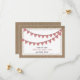 A casual wedding save the date featuring an illustration of red gingham bunting over a lace inspired design. Background on front and back is burlap and lace inspired.