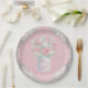 Burlap and mason jar baby shower paper plates with beautiful pink rose and baby's breath mason jar on a pretty pink and silver white burlap swirl background. These sweet rustic burlap mason jar baby shower paper plates are easily customised for your event by simply adding the text of your choice, or you can delete the text.