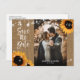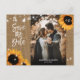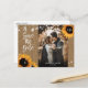 Rustic floral save the date photo postcards featuring sunflowers and string lights on a burlap background. Ideal card design for a rustic-themed wedding party inspired by sunflowers.