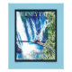 A digital painting of a waterfall found in California, Burney Falls. A brown and white butterfly is on a branch that is stretching across the scenic view. Image Copyright ©2023 Kimberly J Tilley.