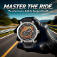 This watch face features a dynamic illustration of a custom motorcycle, engulfed in vivid orange, red, and yellow flames. The bike is rendered with intricate detail, set against a dark background, emphasising motion and power. Silver numbers and watch hands maintain functionality, creating a bold and energetic accessory for motorcycle enthusiasts who appreciate dramatic art.