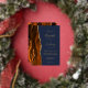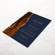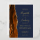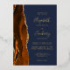 The left-hand edge of this elegant modern wedding invitation features a burnt orange watercolor agate border trimmed with faux gold glitter. The customisable text combines real gold foil handwriting, copperplate and italic fonts on a dark navy blue background. The reverse side features a matching burnt orange and gold agate design.