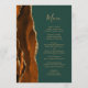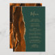 The left-hand edge of this elegant modern wedding menu features a watercolor agate border in shades of rust and burnt orange, trimmed with faux gold glitter. The customizable text combines gold-colored handwriting script and copperplate fonts on a dark green background. The reverse side features a matching rust and gold agate design.
