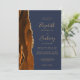 The left-hand edge of this elegant modern wedding invitation features a burnt orange watercolor agate border trimmed with faux gold glitter. The customisable text combines gold-coloured handwriting, copperplate and italic fonts on a navy blue background. Add your favourite photo to the reverse side, along with additional text and a QR code to send guests to your wedding website.