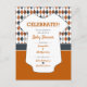 Oversized elegant argyle pattern in school colours of burnt orange and grey set the backdrop for this cute baby shower design. A white baby bodysuit has all the text written on it for the big event, which can be a couples shower or just for mum. Design comes in maroon and grey, burnt orange and grey, red and black, green and black, orange and navy, green and yellow, and purple and grey. Matching products available.