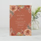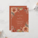 This design features a rich burnt orange background adorned with painterly florals in shades of coral and peach. Delicate blooms and foliage create a warm, romantic atmosphere, perfect for an autumnal or bohemian celebration. The artwork evokes a sense of rustic elegance.