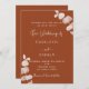 Dark burnt orange background, decorated with eucalyptus stems, sprigs. Personalise and and add your names and the details.