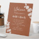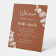 Burnt orange eucalyptus wedding program timeline pedestal sign