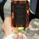 This elegant, modern wedding program fan features a burnt orange agate background trimmed with gold faux glitter. The text appears in elegant gold coloured handwriting and copperplate fonts on a dark off-black rectangle.